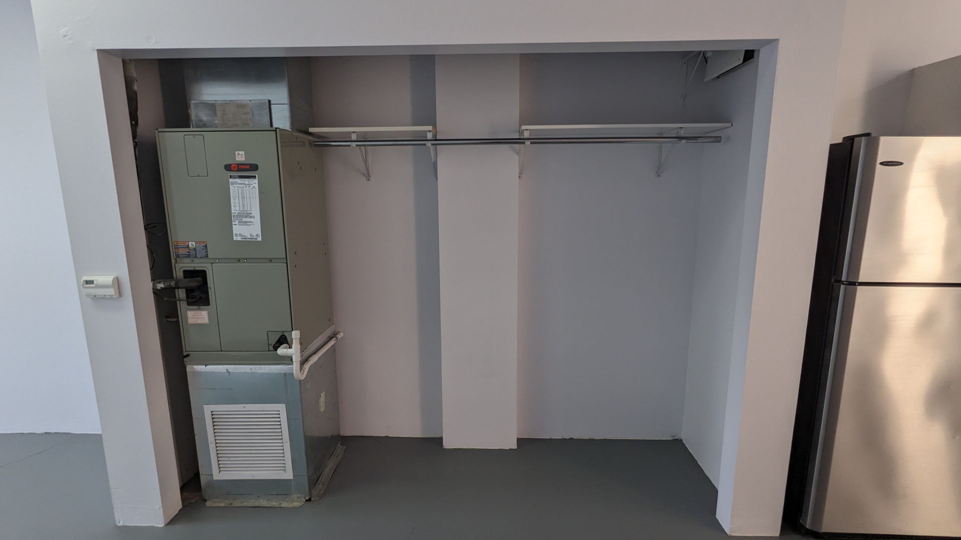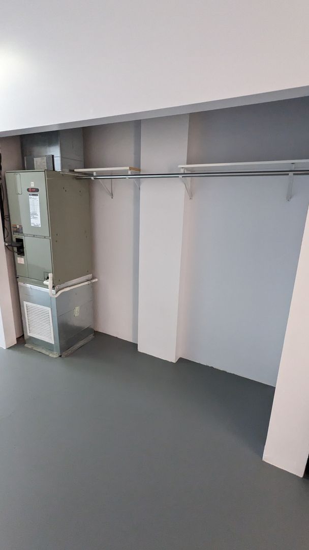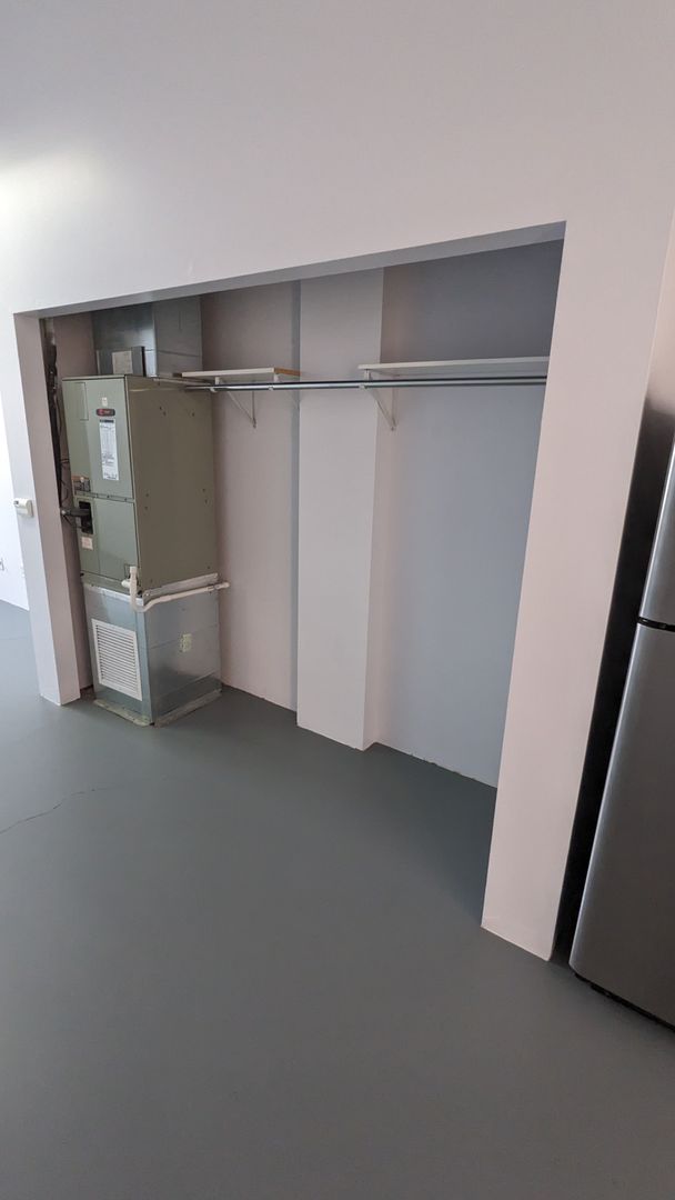 The kitchen is a chef's dream with stainless steel appliances, including a dishwasher, microwave, and a glass top range. The concrete flooring adds a modern touch to the space, and the double sink and abundant cabinet space make for a practical and stylish kitchen. The apartment also includes a linen closet and a coat closet for additional storage.