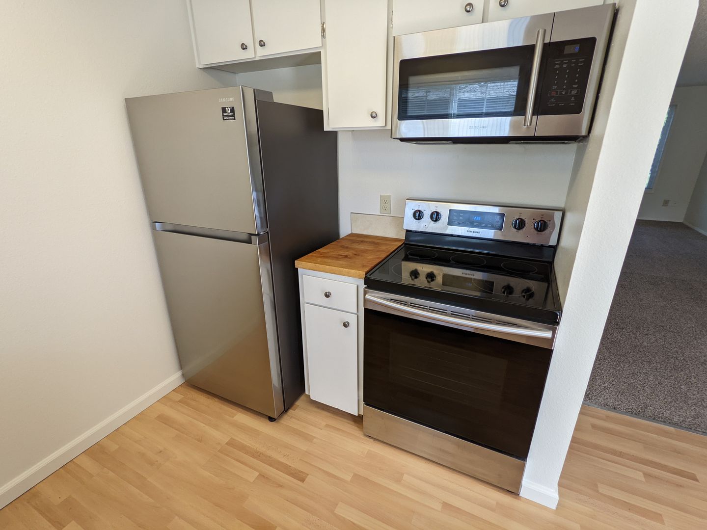 The kitchen is equipped with stainless steel appliances, including a dishwasher, microwave, and a glass top range, and boasts abundant cabinet space. The primary bedroom comes with double closets, providing ample storage space. Includes are a stackable washer/dryer, a linen closet, a coat closet, and a staircase closet. The property is pet-friendly, with a $300 pet deposit and $25 pet rent.