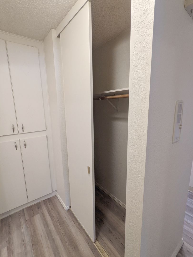 The bathroom offers ample storage and a bathtub/shower combo, while the apartment also boasts a linen closet, coat closet, and hall closet for additional storage. The vanity lighting adds a touch of elegance to the space. The building is secured access, ensuring peace of mind.