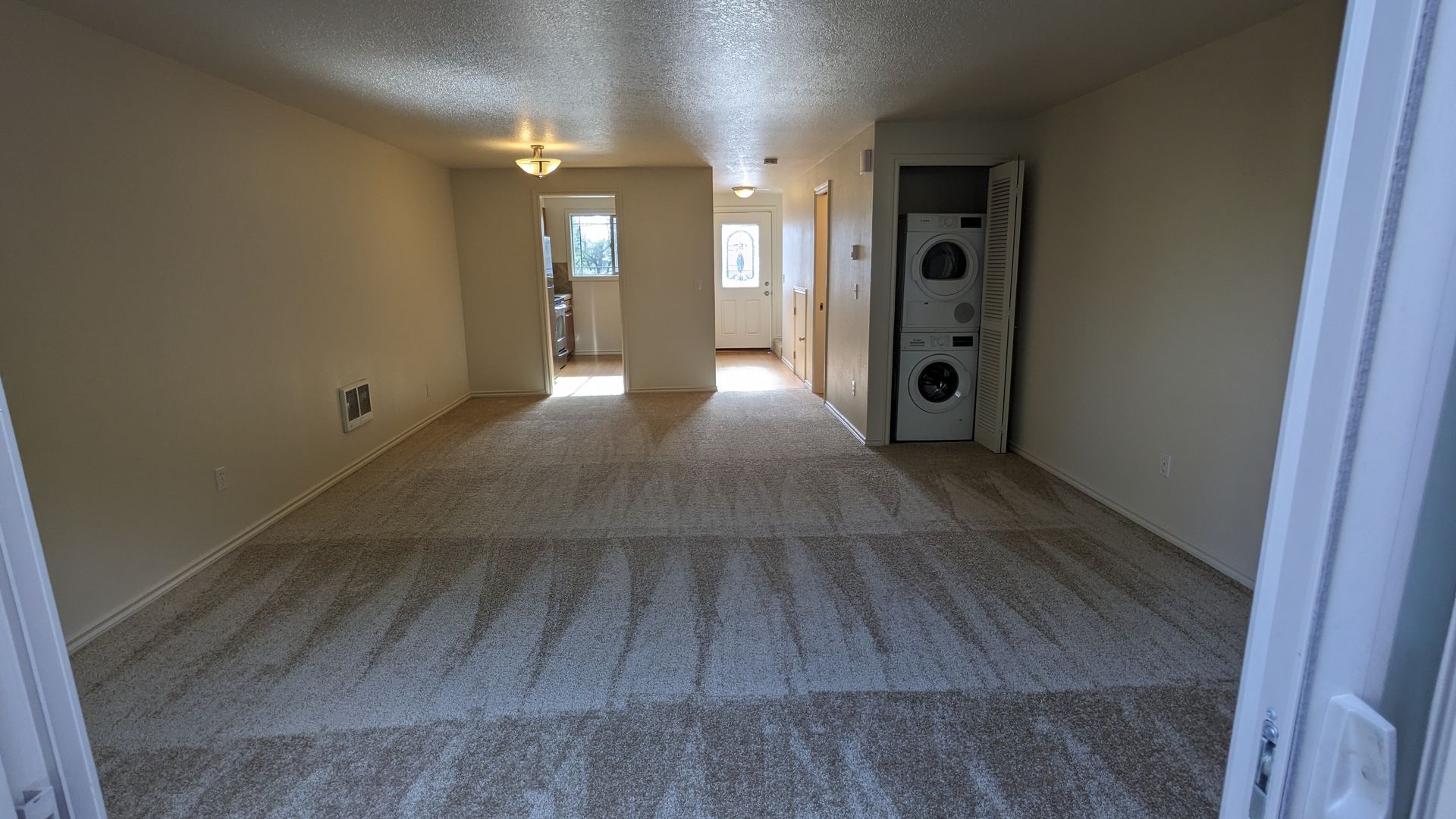 The primary bedroom features a walk-in closet, and the bathroom offers ample storage and a bathtub/shower combo. included are a stackable washer/dryer for your convenience. Enjoy the outdoors with your private, fenced patio. The front door features decorative glass, adding a touch of elegance to your home.