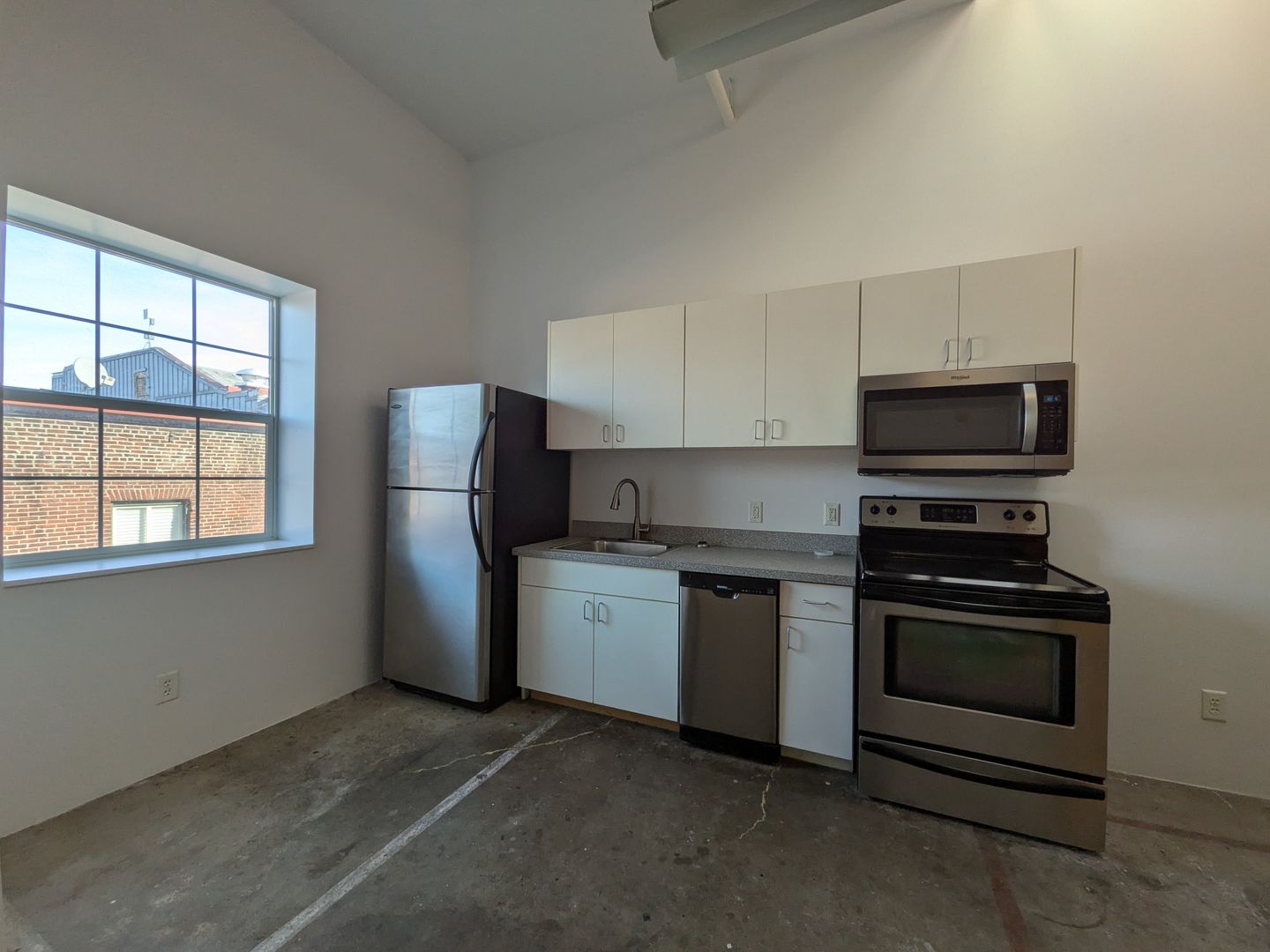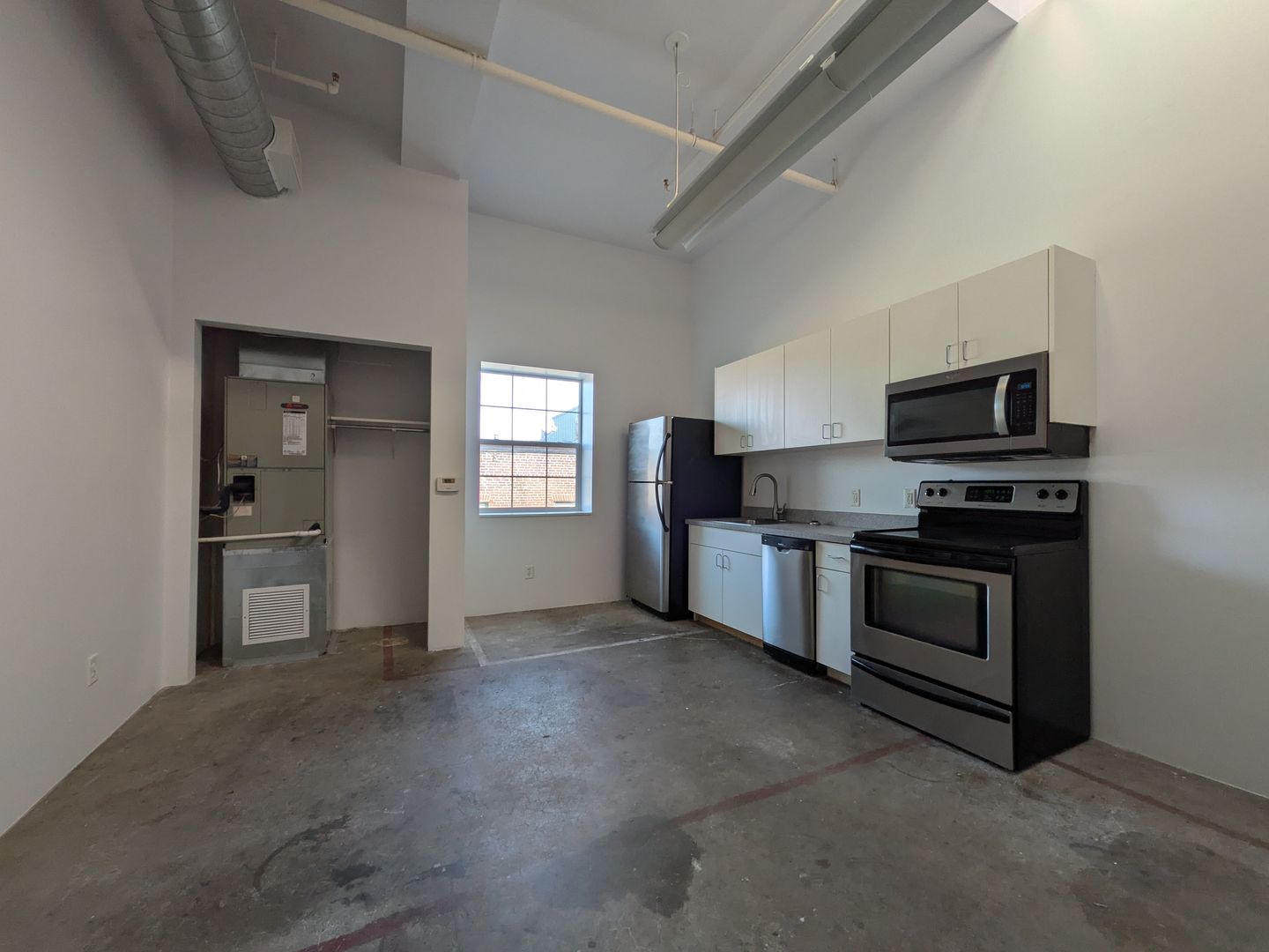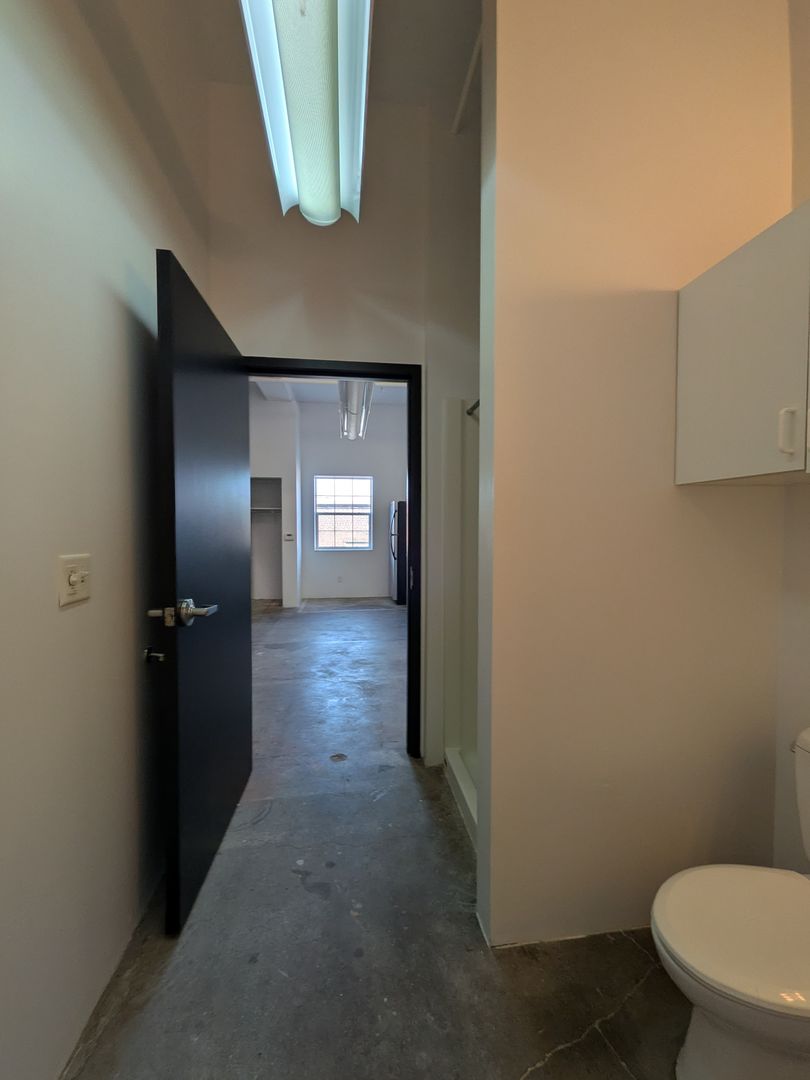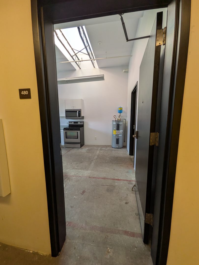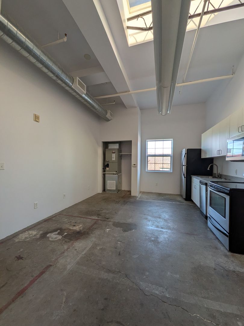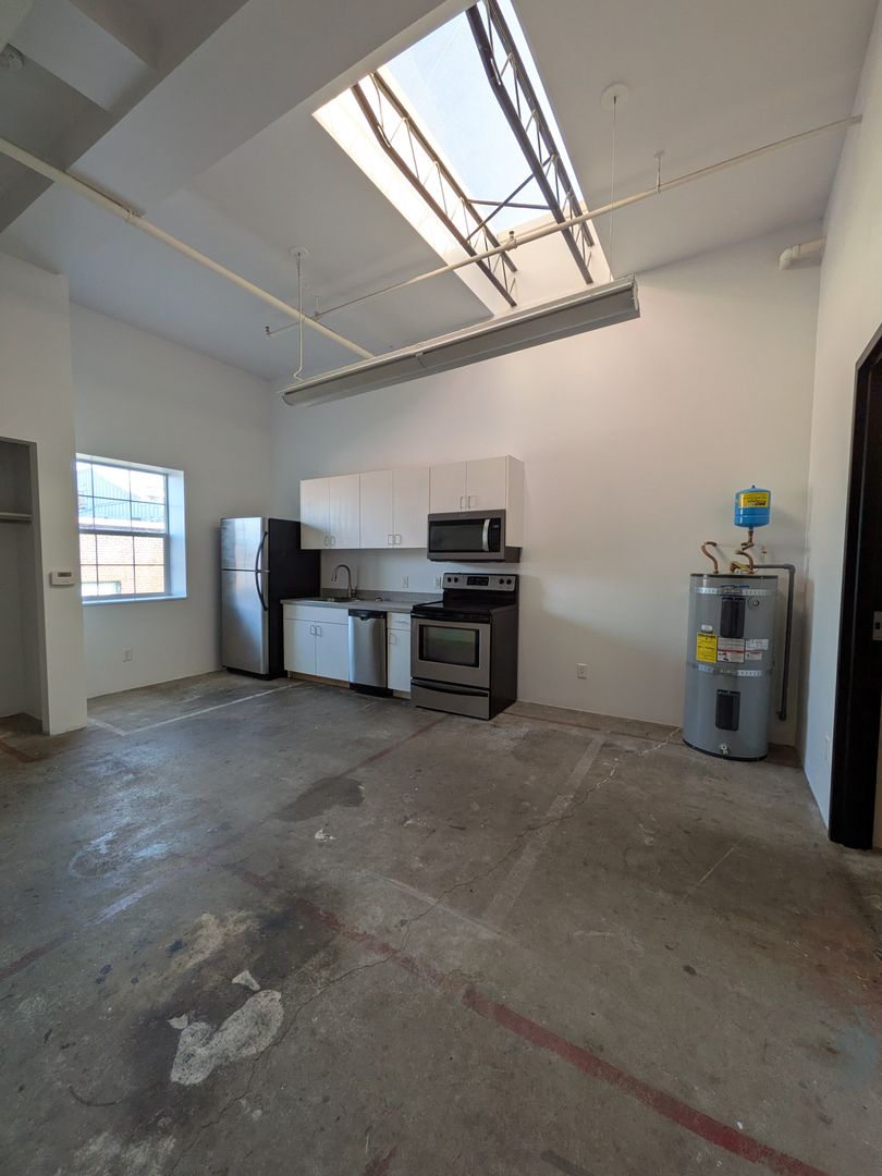 Welcome to your new home in Salem, OR! This top-floor studio that boasts a spacious living area with 12-foot vaulted ceilings and a skylight, bathing the space in natural light. The open floor plan is complemented by large windows and concrete flooring, creating a modern, industrial aesthetic. The kitchen is equipped with stainless steel appliances, including a dishwasher, microwave, and glass top range, and offers abundant cabinet space.