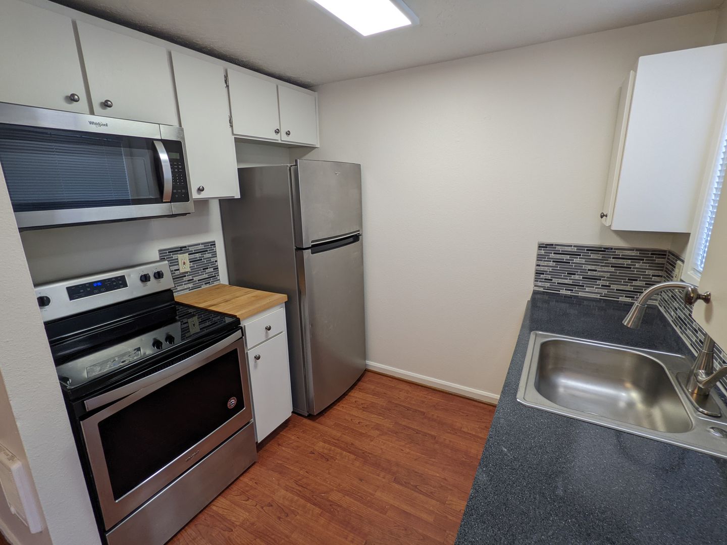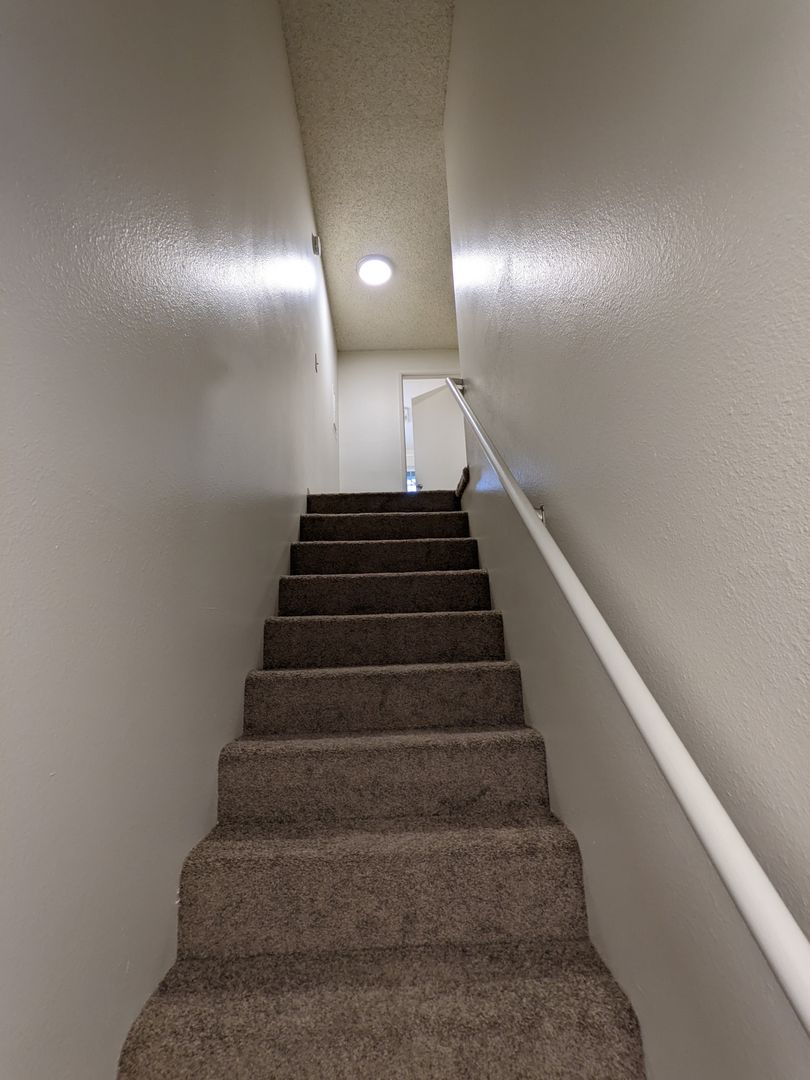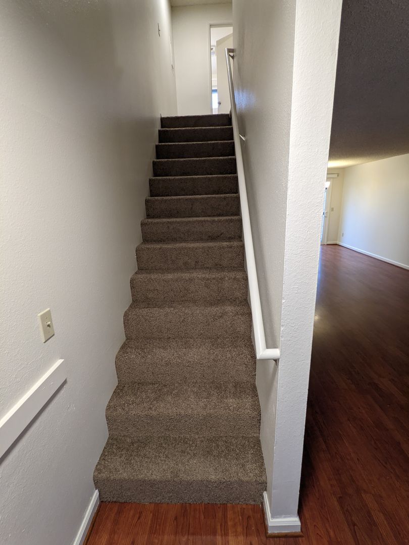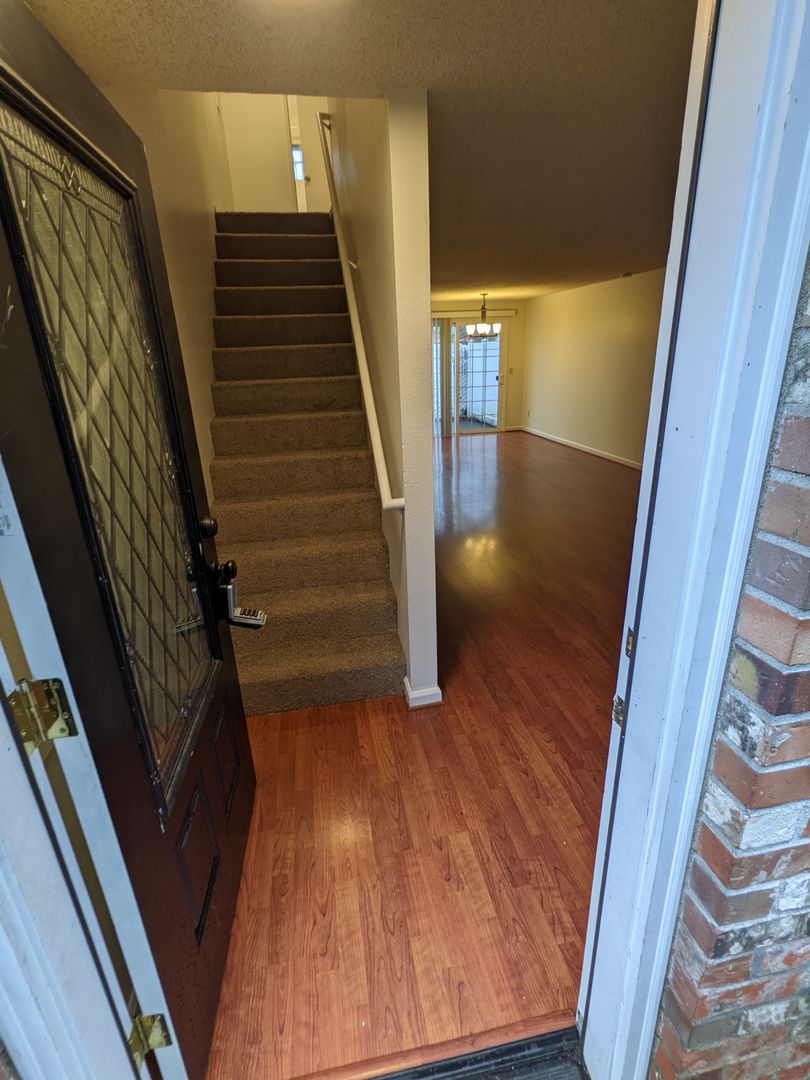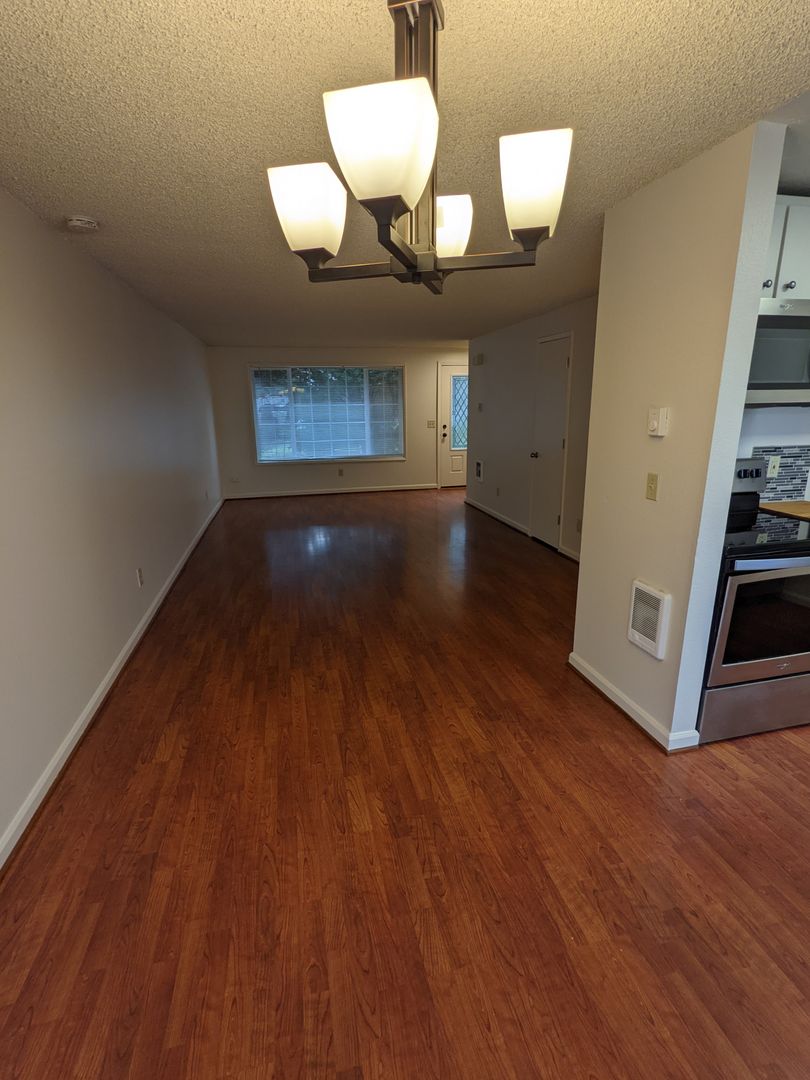 Manor Townhomes presents a 2-bedroom, 1.5-bath end-unit townhouse in Portland. This home features LVP flooring in living areas, carpeted bedrooms, a glass-top range, microwave, refrigerator, dishwasher, and stainless-steel appliances.