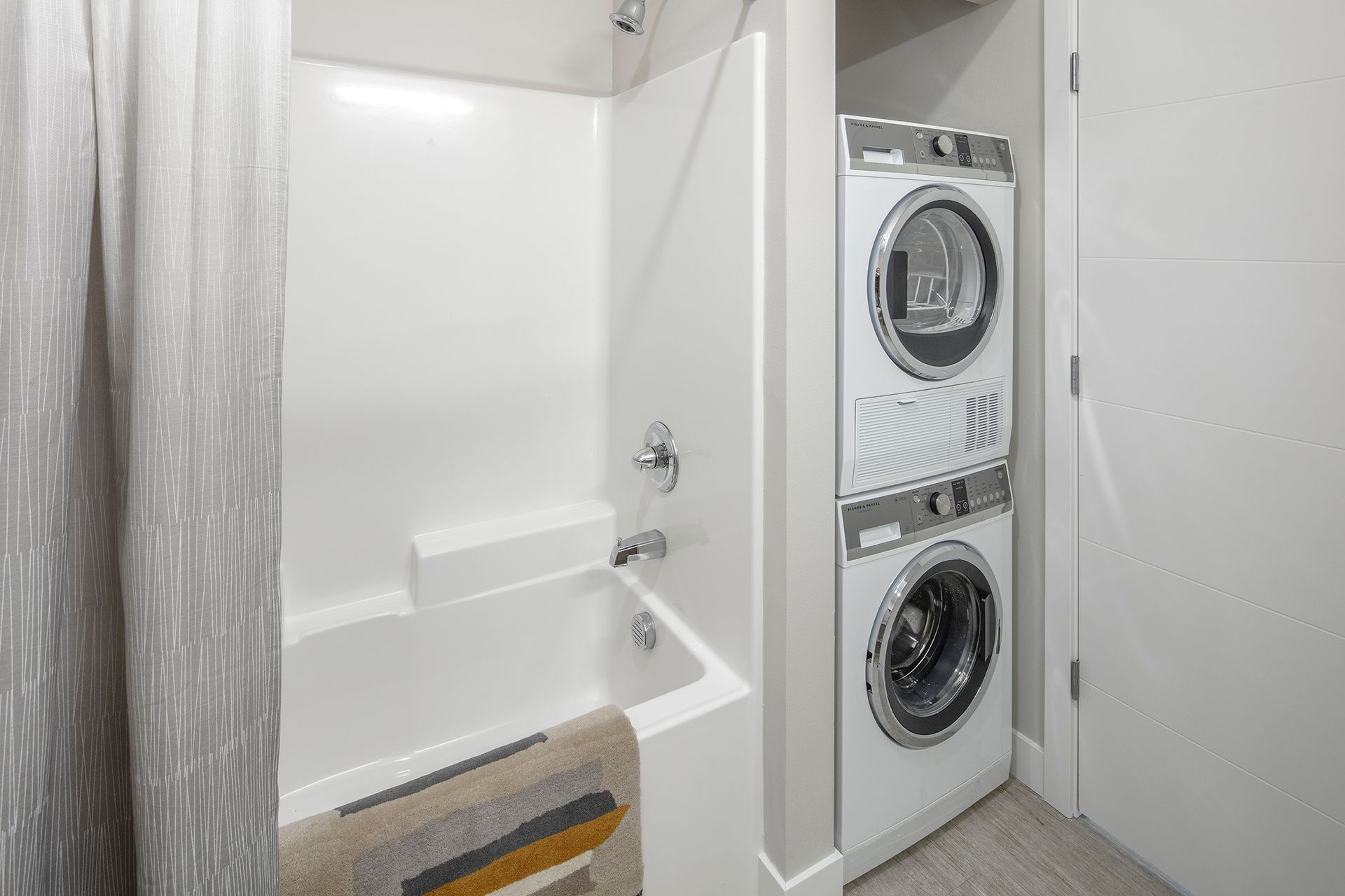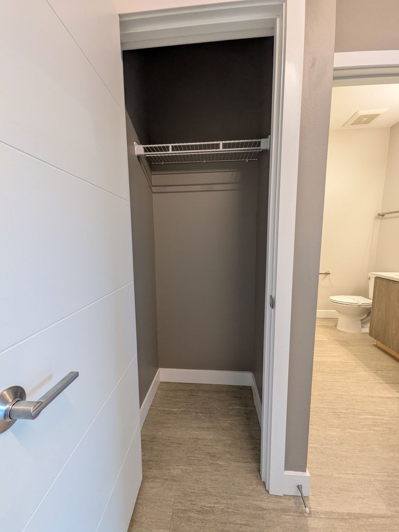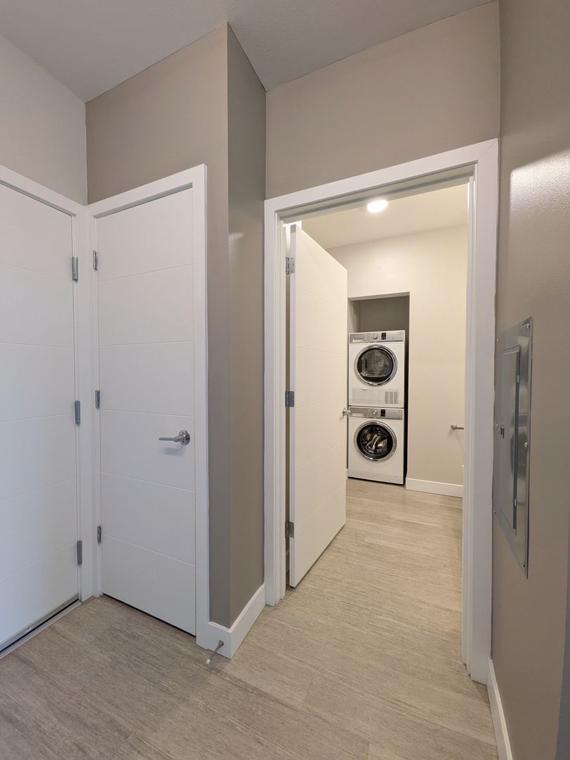 The bathroom offers a bathtub/shower and bathroom storage, and the bedroom includes a walk-in closet plus additional coat closet space. In-unit stackable washer/dryer, vanity lighting, and secure building access add convenience, while an elevator and package concierge serve residents.