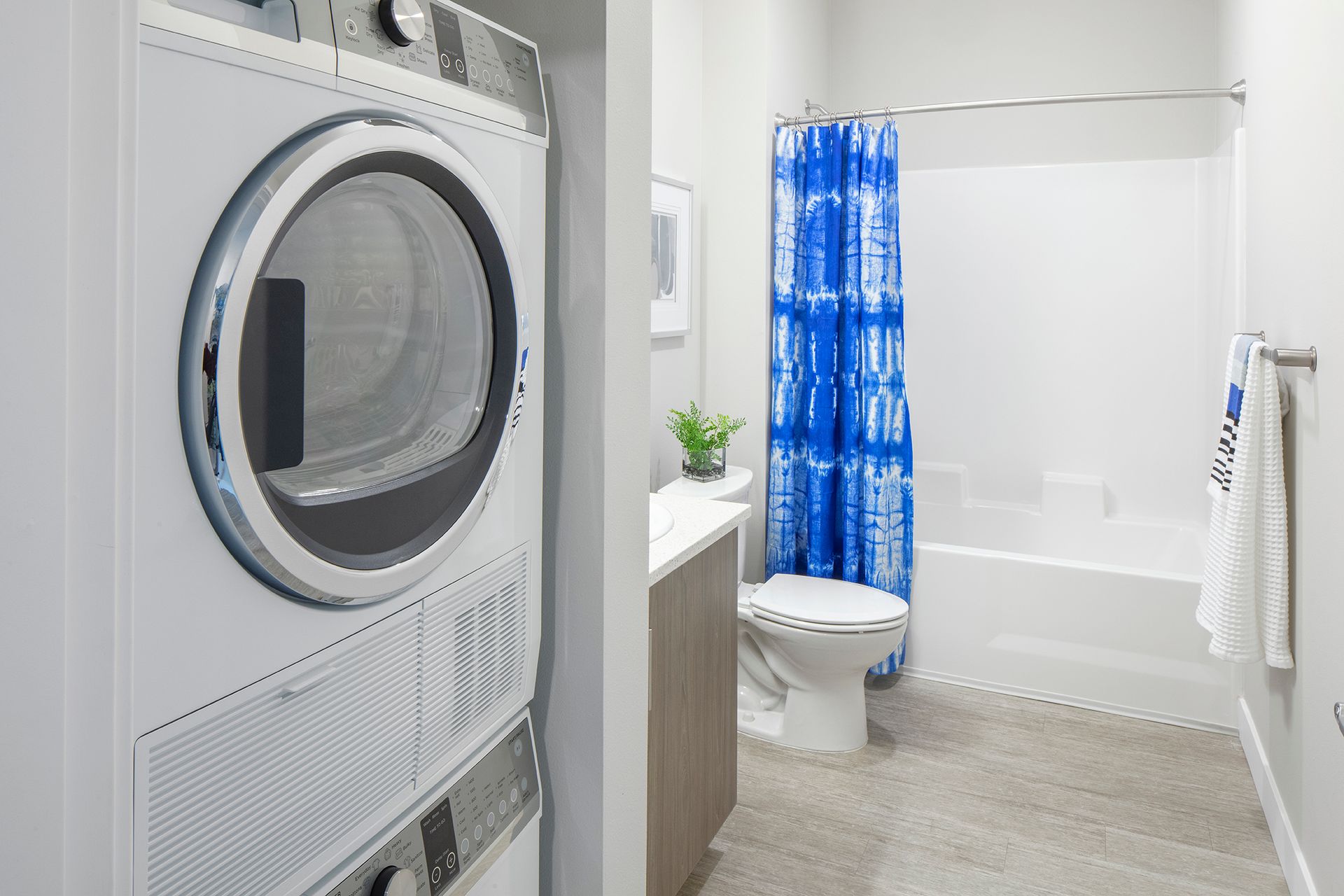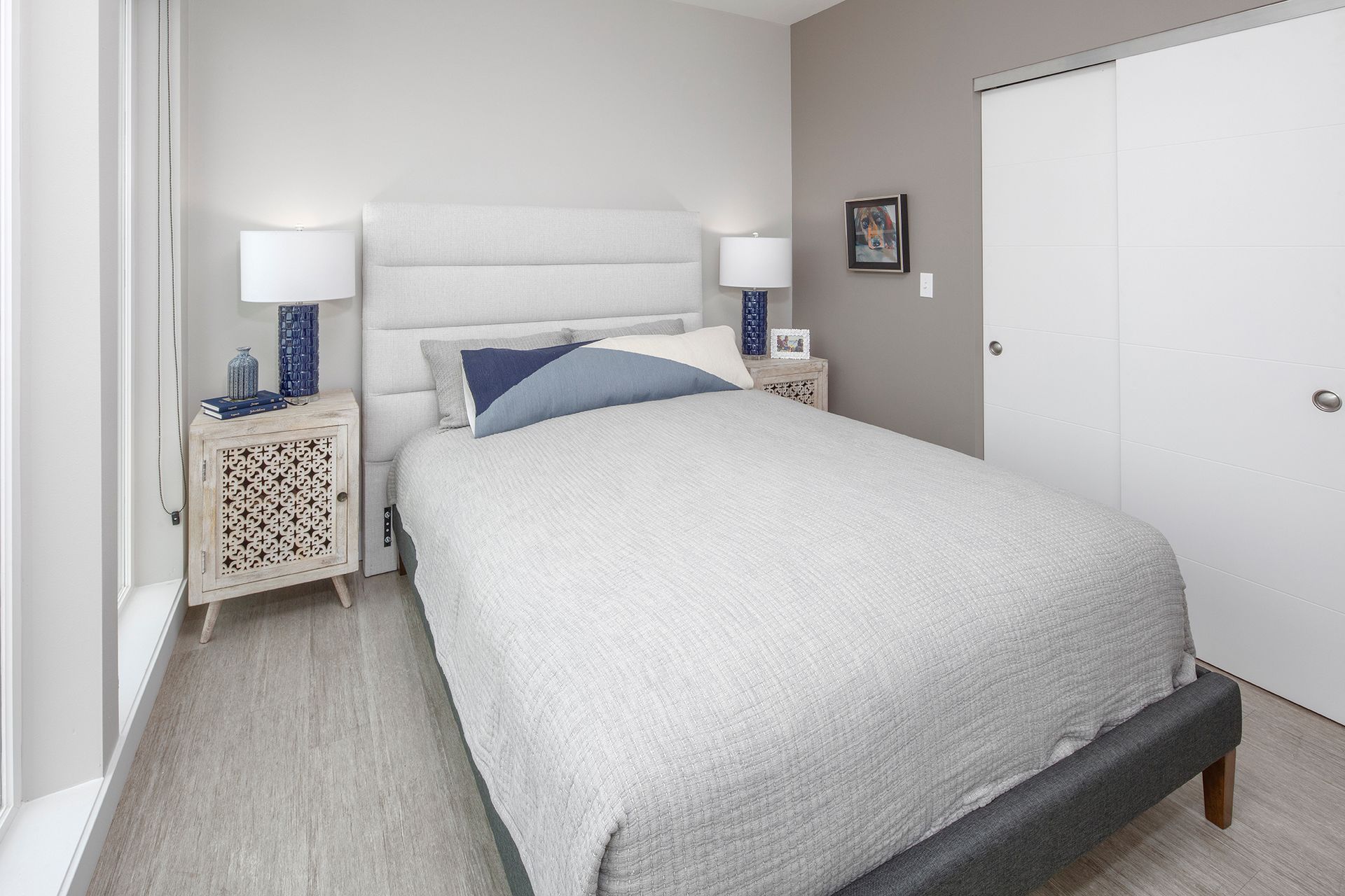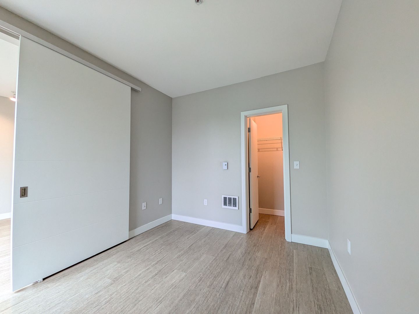 The bathroom offers a bathtub/shower and bathroom storage, and the bedroom includes a walk-in closet plus additional coat closet space. In-unit stackable washer/dryer, vanity lighting, and secure building access add convenience, while an elevator and package concierge serve residents.