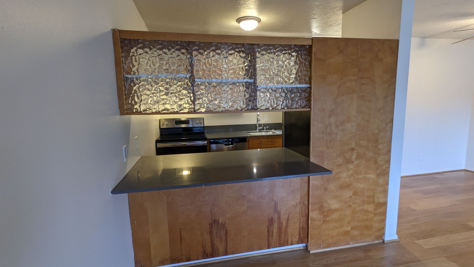 Featuring a large living area with ample natural light streaming in through large windows, a dining area, and a kitchen bar. The kitchen is equipped with a dishwasher, a glass top range, and stainless-steel appliances, complemented by ample cabinet space. The bedroom is carpeted and boasts double closets, while the bathroom offers both a bathtub/shower and additional storage.
