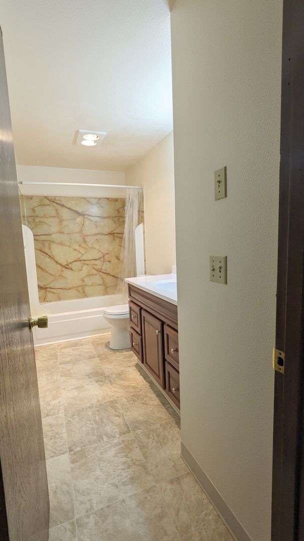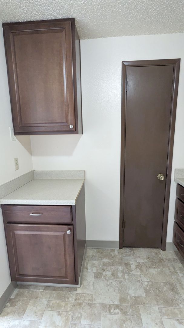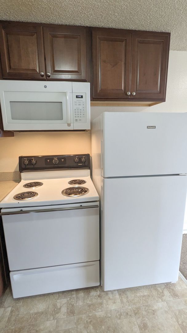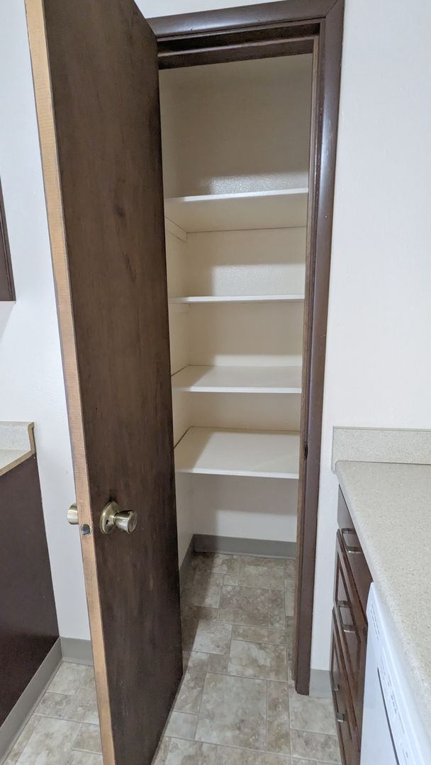 The kitchen is equipped with a refrigerator, stove, dishwasher, microwave, and abundant cabinet space, including a pantry. The bathroom boasts a bathtub/shower combo, vanity lighting, and additional storage space. Also included, a linen closet and a coat closet, providing ample storage throughout.