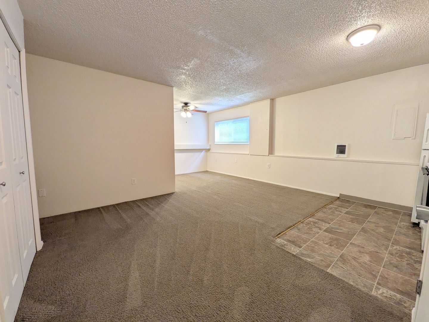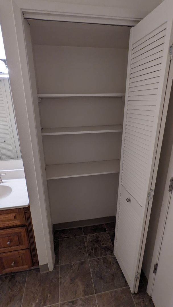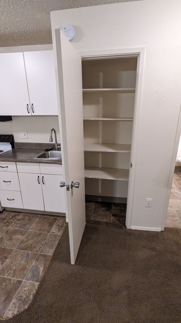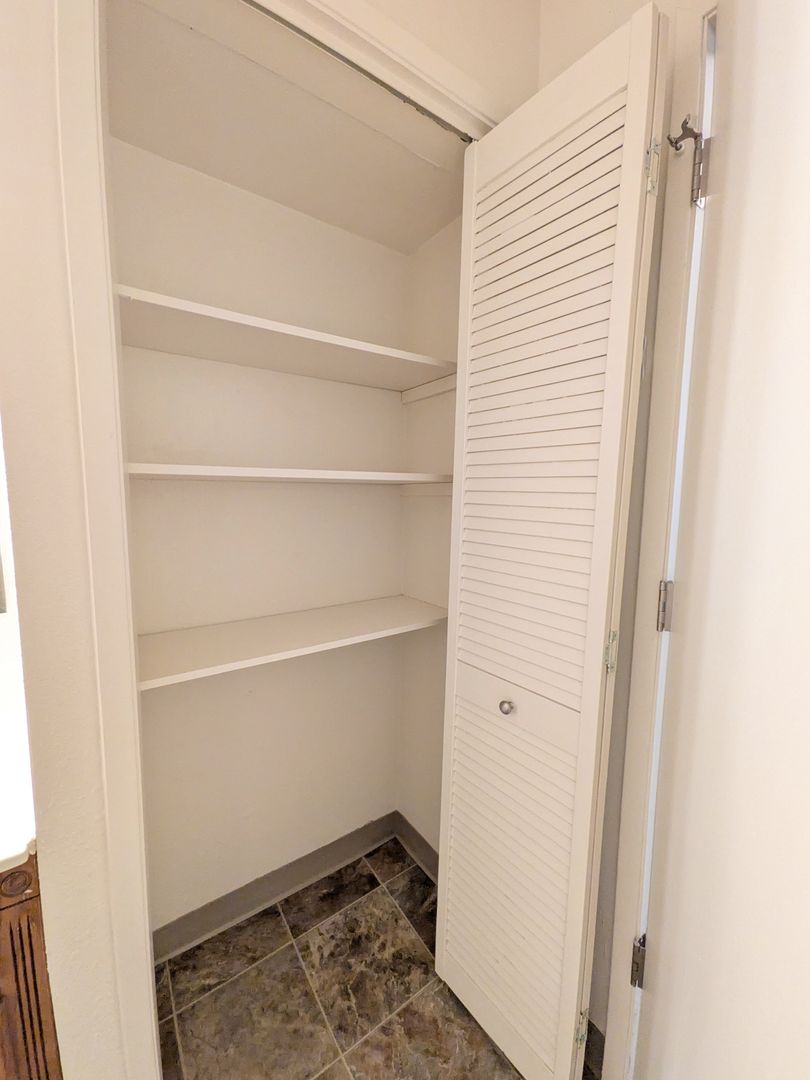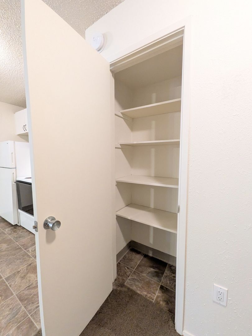The kitchen is equipped with a garbage disposal, microwave, and abundant cabinet space, while a pantry and linen closet provide additional storage options. The bathroom features a stand-up shower, vanity lighting, and ample storage space. The apartment also boasts a ceiling fan and large closets for your comfort and convenience.